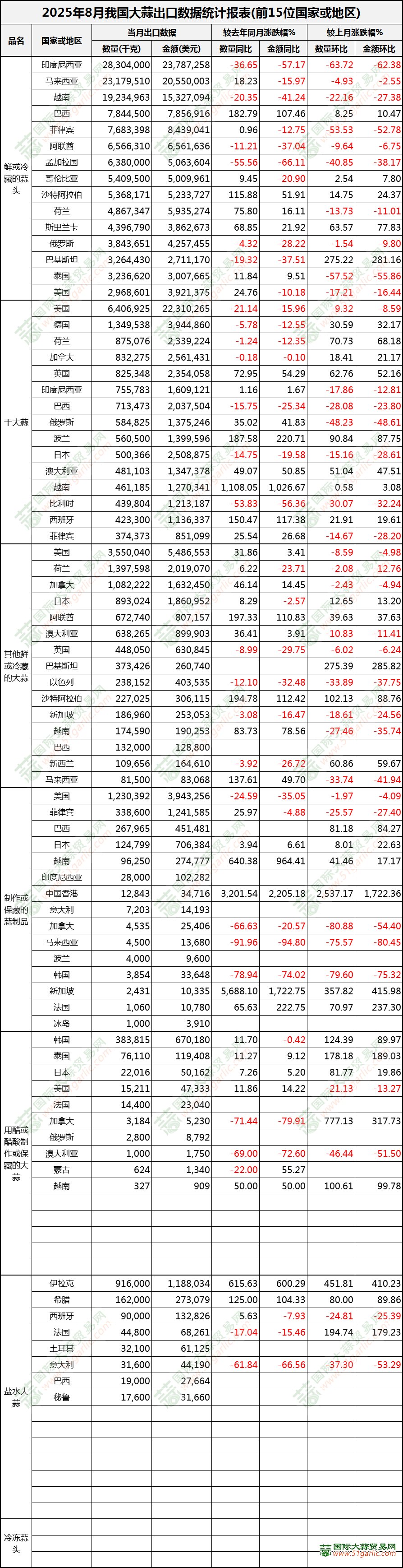 2025年8月大蒜出口數(shù)據(jù)(按國家)