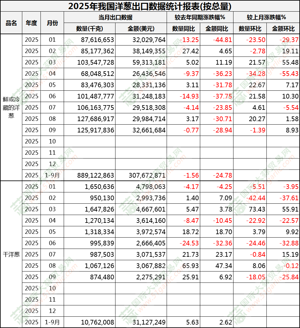 2025年9月洋蔥出口數(shù)據(jù)(按總量)