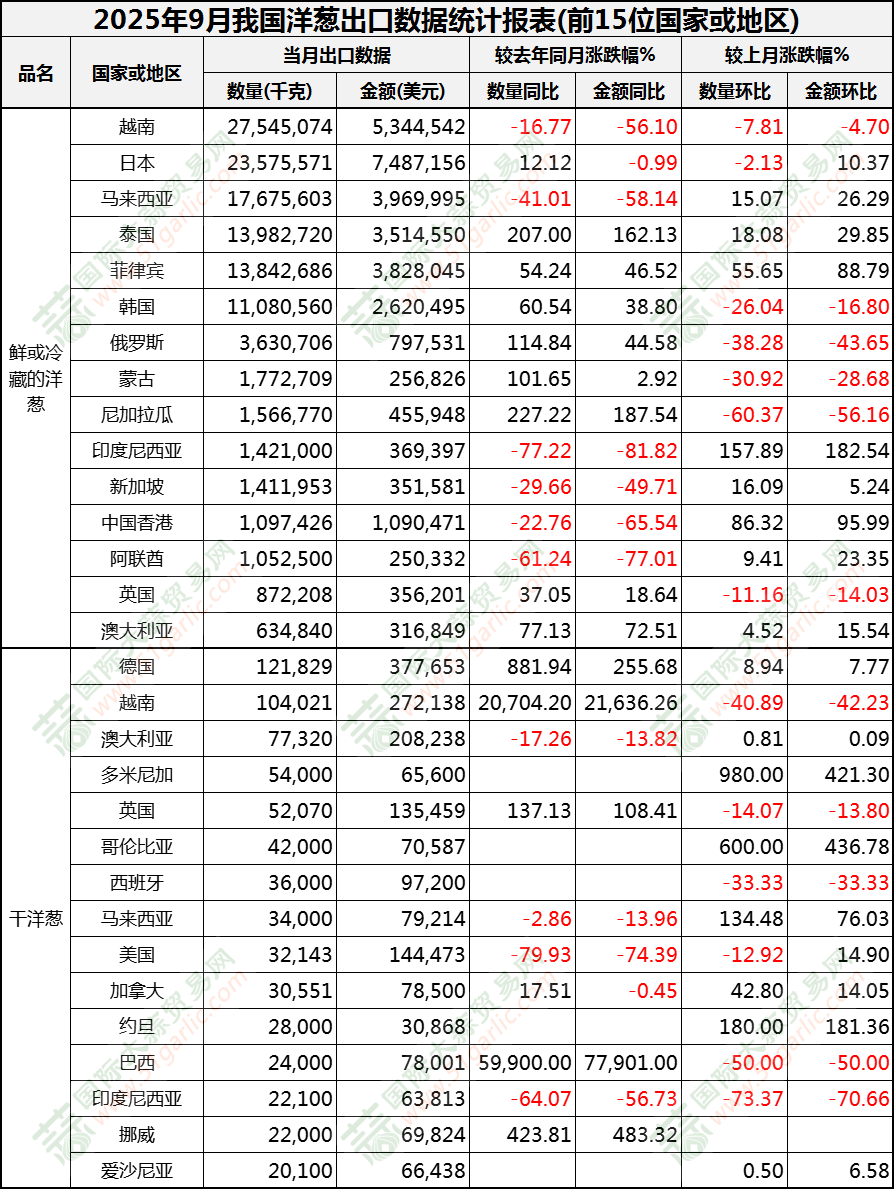 2025年9月洋蔥出口數(shù)據(jù)(按國家)