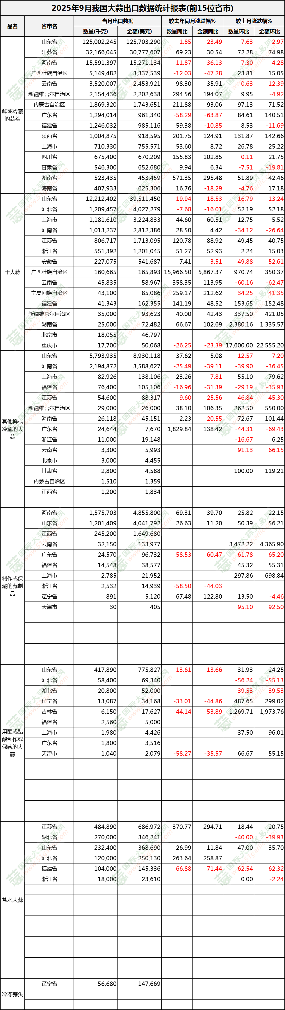 2025年9月大蒜出口數(shù)據(jù)(按省市)