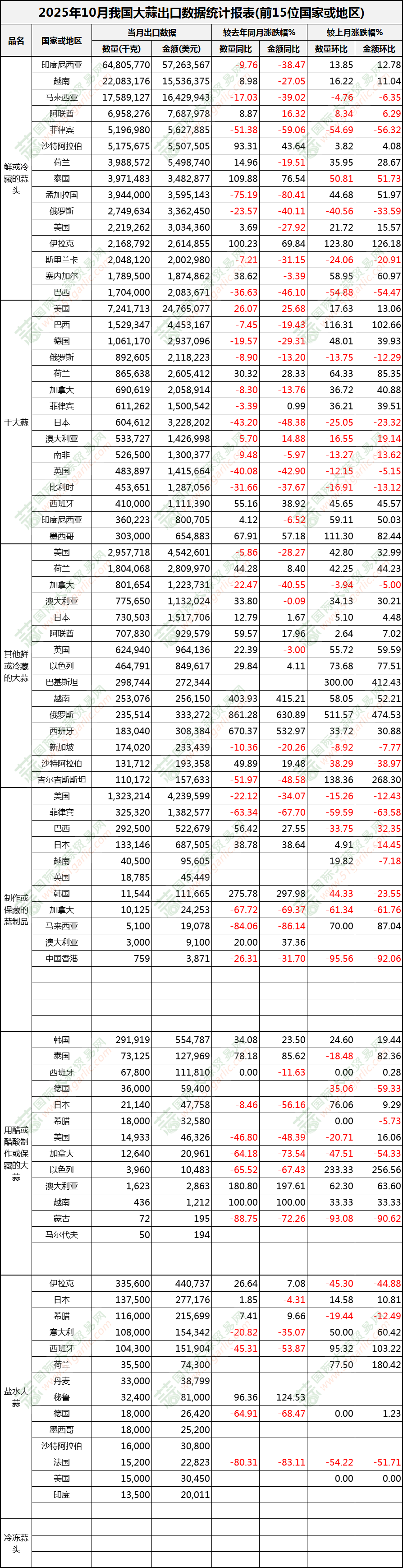 2025年10月大蒜出口數(shù)據(jù)(按國家)